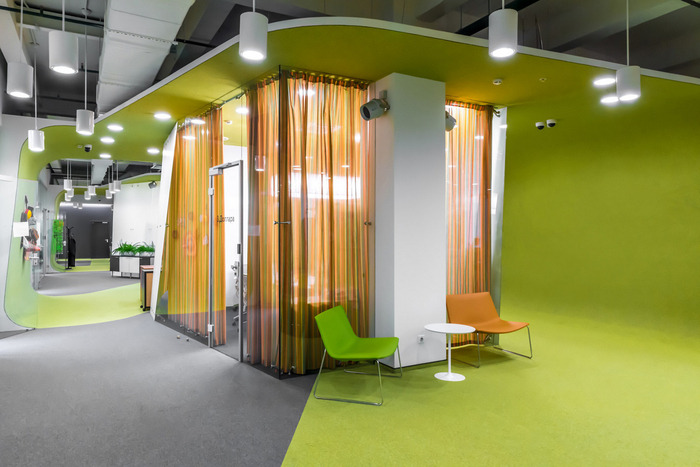 天花板上开放的通信线路,复杂几何盒子中独特的吸顶灯,还有花朵拖到天花板上的复合花盆。壁龛沙发被用作明亮的颜色点,以及非正式交流的场所。墙面装饰传统上是工业地毯、标记覆盖物、软木;当然,还有浇筑的地板。