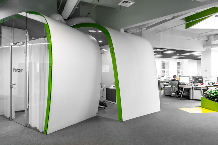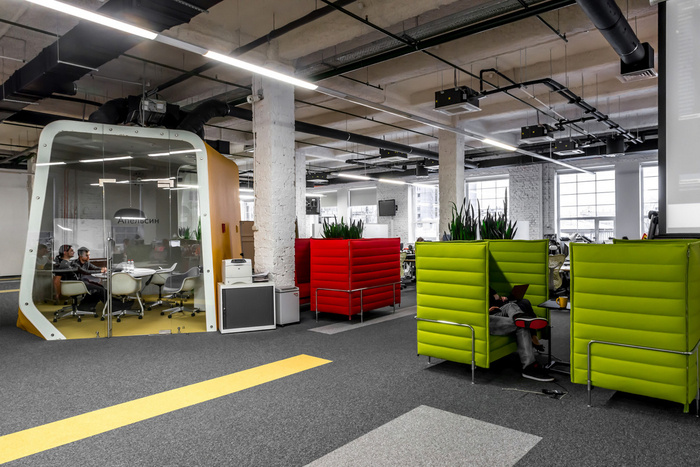 壁龛沙发被用作办公室明亮的颜色点