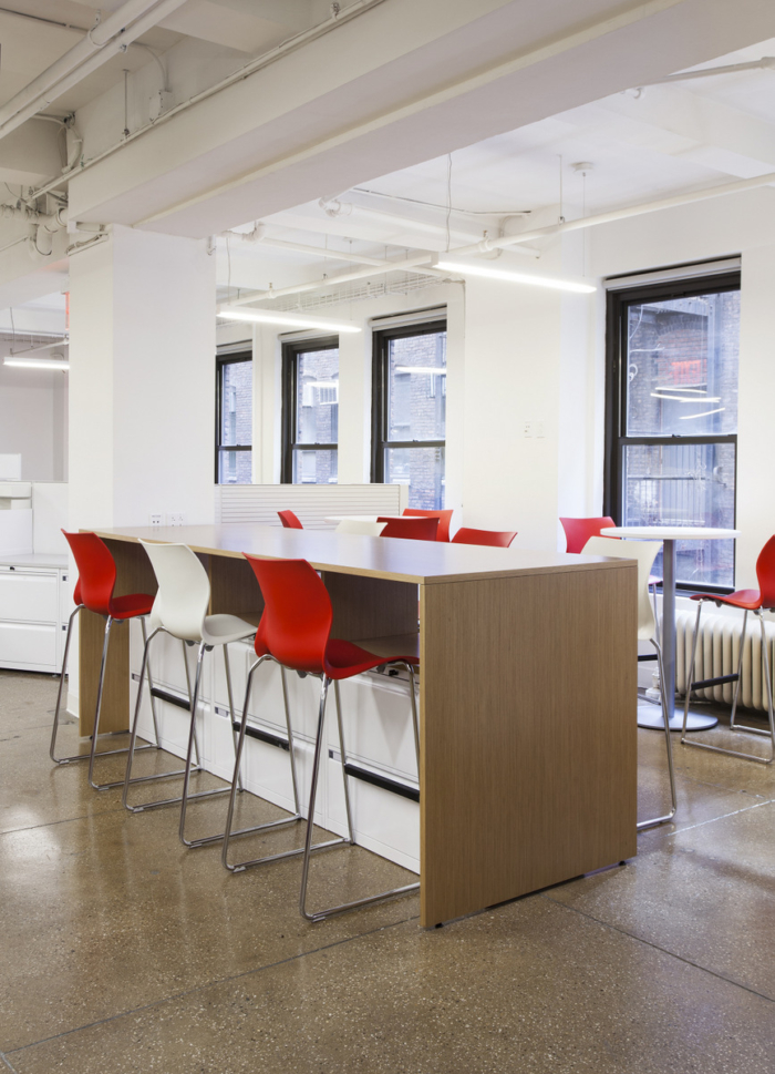 白色和灰色的中性色调辅以干净、现代的材料,如玻璃、混凝土、木材和金属,并通过明亮的色彩搭配以浅绿色和红色装备的家具。灵活的会议室兼作图书馆,可分为三个较小的房间或开放为一个大型会议室,以容纳正式会议和全球访客。分隔墙由玻璃制成,以允许最大量的光线进入室内。