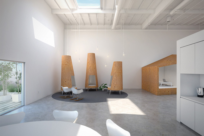 其他混合体包括树椅、山地办公室、屋桌和天洞。每一个都是由简单的胶合板和涂白漆的纤维板构成的。因此,所有工人都可以使用各种微型个人空间和团体规模的集体空间,这种内部办公室和外部世界的概念交织扩展了居住的体验可能性。