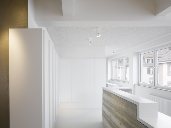 在这个项目中很难找到没有经过深思熟虑的细节。为了在进入时立即吸引游客的注意力,接待台由裸露的粗糙混凝土制成,当然,它靠在原始的白色桌面上。#办公楼设计装修#