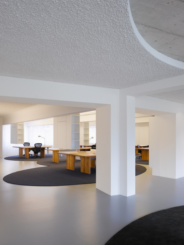 整个这些区域的天花板都用灰泥覆盖,为商业环境带来家常、熟悉、公寓般的感觉。一旦进入主要工作空间,搁架单元就挂在天花板上,这实际上很好地打破了房间的大小。