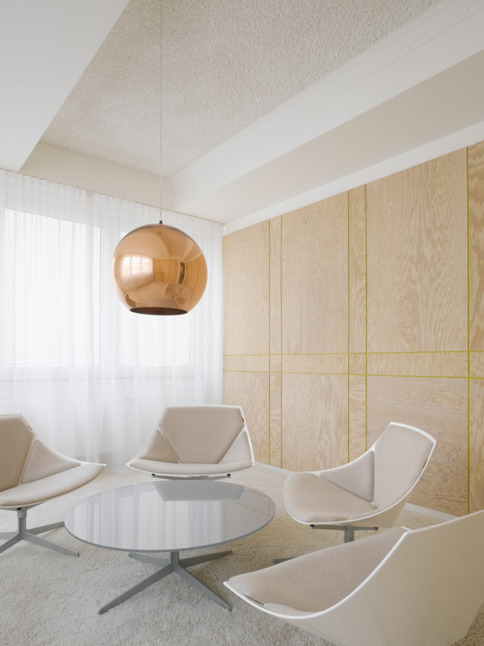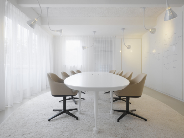 会议室有类似的前卫细节,如带有黄色重点凹槽的木镶板。另一个包含一张桌腿位置随意的会议桌,营造出一种更有趣的态度。