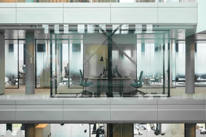 设计通过优化使用位于中央的中庭,着眼于办公室的宽敞感。电话亭、工作场所和座位几乎紧靠中庭放置,以最大限度地利用空间效果。开放区域与封闭的办公室和会议室交替出现,美丽的材料和柔和温暖的色彩的使用给办公室带来了温馨和商务的外观。
