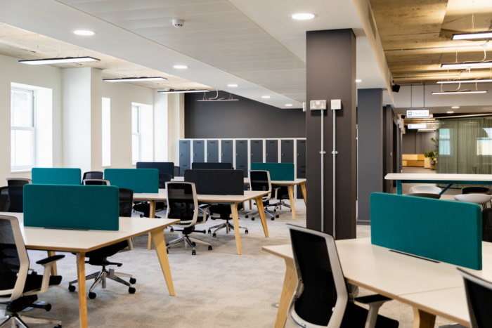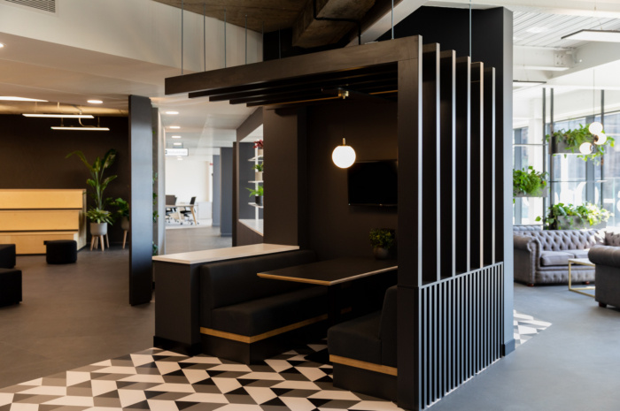 灯箱指示团队区域,这些区域由特色细木工和绿色植物自然分隔,令人印象深刻的接待处设有定制办公桌,毗邻私人精品会议空间。