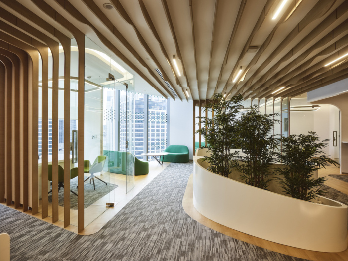办公室设计装修:木鳍制成的天花板对角地穿过整个办公室空间