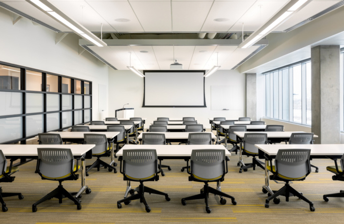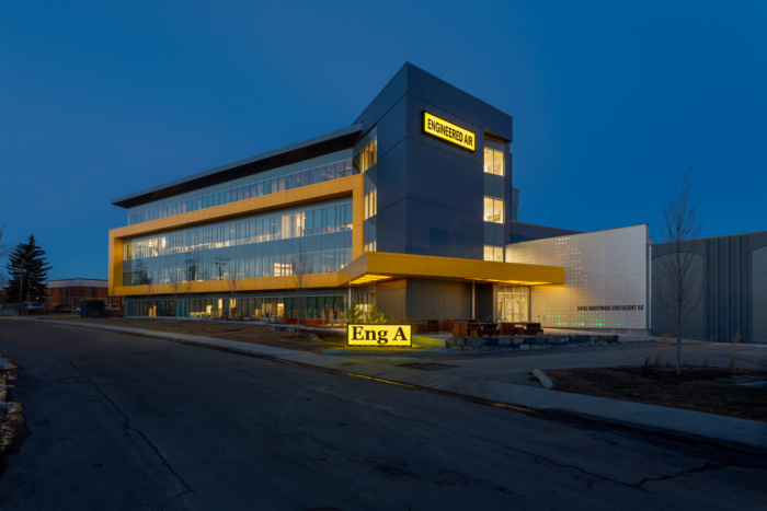 办公室采用现代设计,使用玻璃、拱肩和金属板材料。入口区域具有独特的几何形状,以提供遏制吸引力,并充当与街道平行的大型行人天篷并连接两个建筑物入口的媒介。#办公室设计装修公司#
