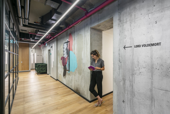 木材、混凝土、玻璃和黑色金属等永恒的材料包裹着建筑的核心,为将充满活力的图形元素层叠在顶部创造了完美的基础。在这里,核心墙是一个自由表达的地方——拥抱源自网络世界的图形艺术。#办公室装修效果图#