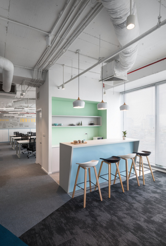 设计师基于上述标准接近和构建概念的项目,在对客户进行分析和研究后,将企业办公室的这一概念命名为“蓝芯”。该项目的主色调是从品牌标识的颜色范围中挖掘出来的,选择蓝色来保留蓝芯的概念,这是一种唤起整个项目技术的颜色。