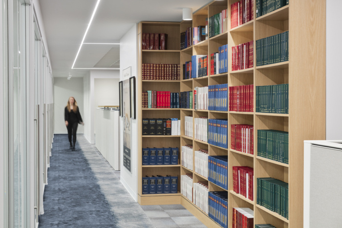 设计饰面采用现代、有机的方法,采用柔和的线条工作,让纹理更加引人注目。虽然工作休息区的设计让人想起起居室的美学,以提供一个私密的、更个性化的交谈区域,但穿过走廊欢迎员工在现代图书馆中找到独处,以庆祝法律实践。