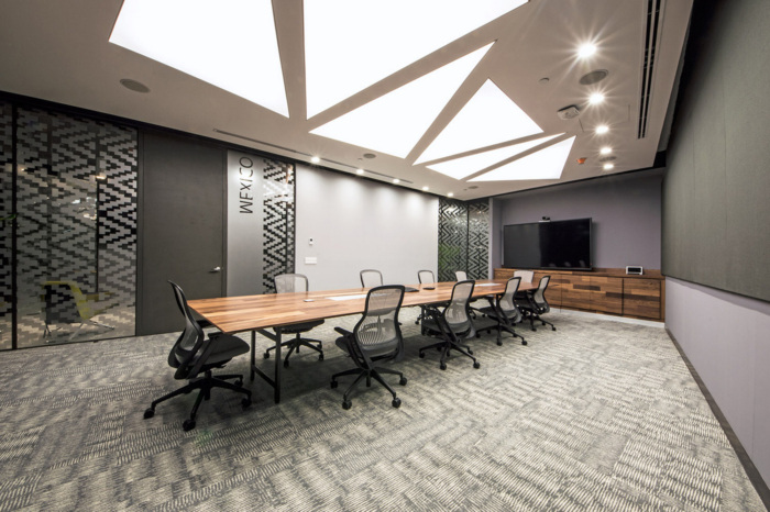 色彩鲜艳的地毯和为空间增添动感的图案,以及自助餐厅和接待区地板的乙烯基瓷砖。虽然灰色在整个空间中占主导地位,但这些公司办公室并不晦涩,因为室内项目确保大部分区域都有自然光和鲜艳的色彩,使这个公司办公室拥有客户想要的形象和要求。