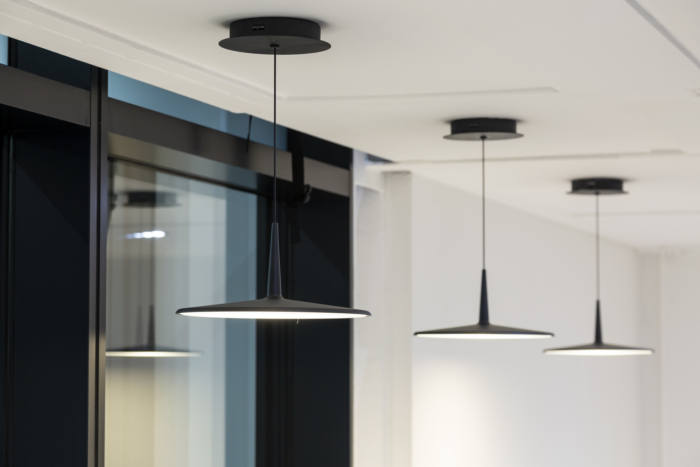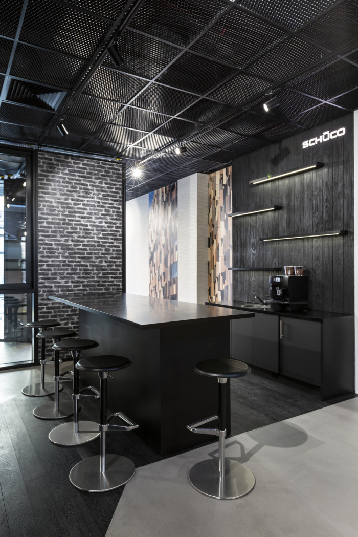 主要功能包括带有内置 LED 照明的悬挂式木天花板板条、陈列室的轨道照明、折叠墙(客户自己的产品)、茶点区的定制烧木包层墙、拉伸金属天花板、定制展示架、定制壁纸以客户自己的作品组合为特色,以及带有发光标志的新外立面。