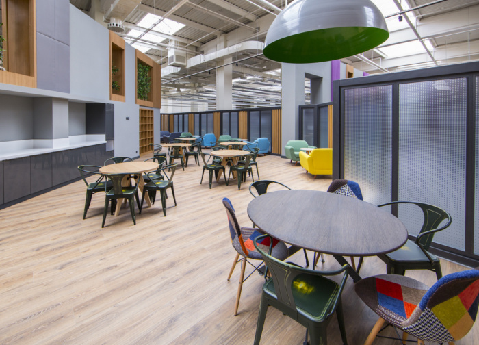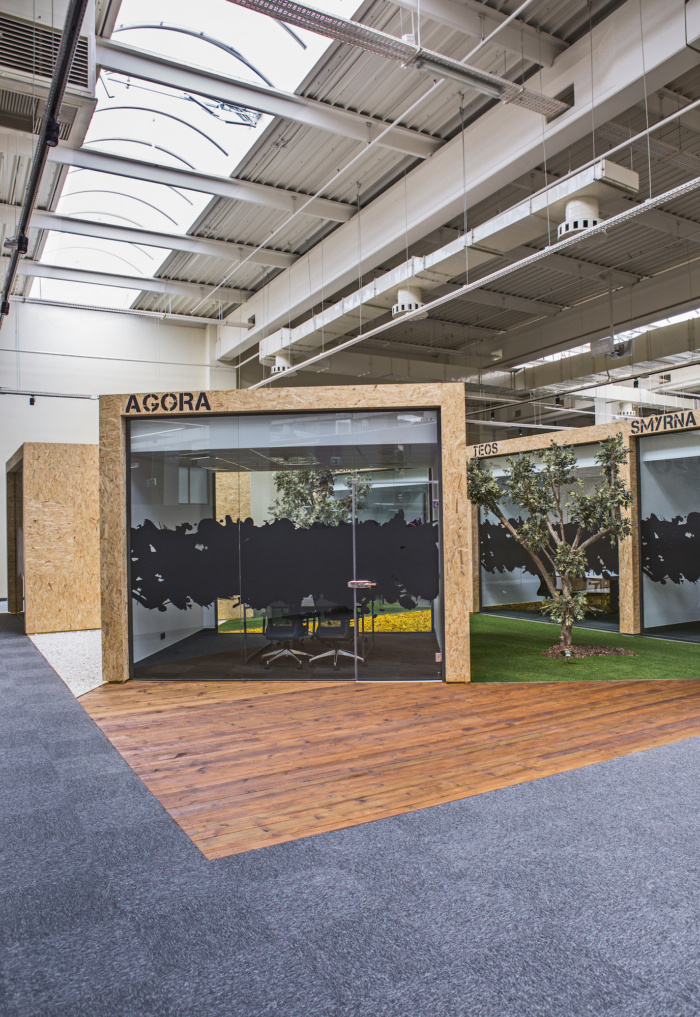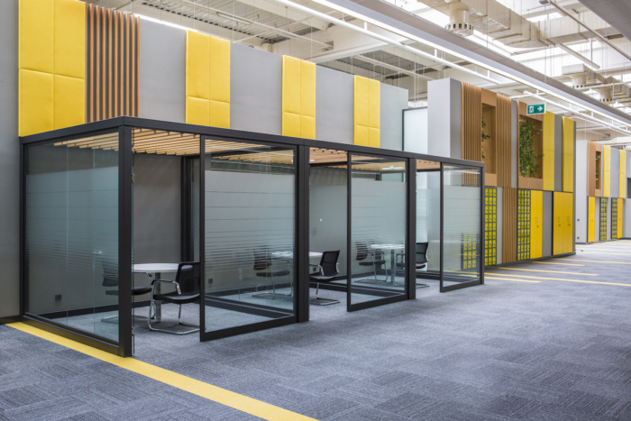 独立于墙壁和天花板的会议室、休息室和研讨厅被设计成不同材料和颜色的浮动盒子,旨在打破现有结构的统一性。这些单元被认为对所有写字楼办公室都可以轻松到达的共享空间开放,同时提供具有不同天花板水平的人性化尺度,以及在空间内创造空间的想法。#写字楼装修#