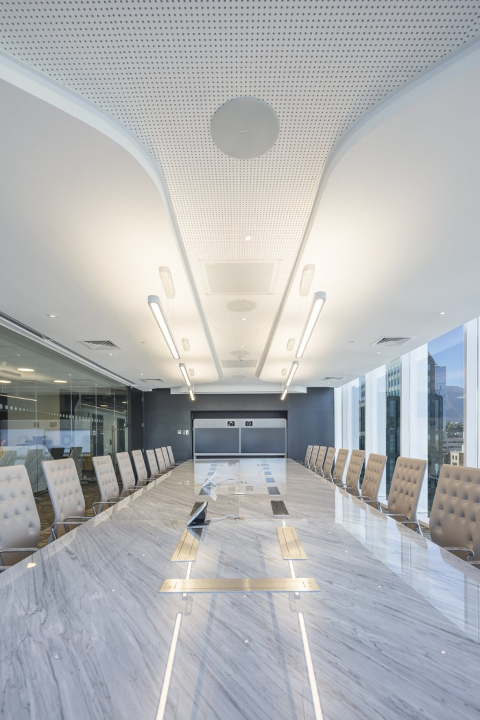 作为7层空间的总体结构,从电梯出来的“广场”是每一层的主要元素。在这里,我们有可以看到安第斯山脉的弧形自助餐厅、会议室和用于非正式会议的不同座位,这是我们每天喝一杯咖啡、协作、到达、见面和离开的空间。上方带有103个LED点的圆形金属天花板,从那里灯光将我们引导到工作空间的不同区域。#办公室写字楼装修公司#