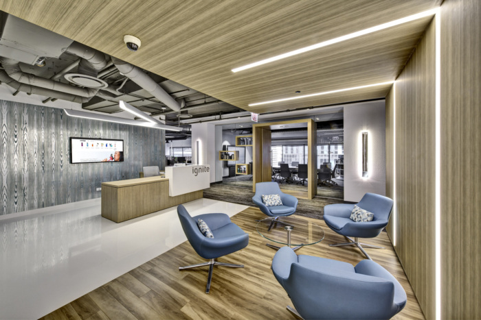 定制设计元素使公司产品引人注目,与姐妹空间保持同步。多个玻璃特色墙上的浮动木制品箱自豪地展示了客户的产品。同样的细节在行政会议室宽敞的木质入口处得到了更大的体现。