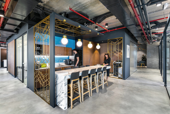 木材和大理石的自然纹理与受装饰艺术启发的干净几何黄铜格子相结合,为独特的业务创造了独特的一次性身份。一种既引人注目又精致的外观,代表着专业精神和创造力。#广州办公室装修公司#