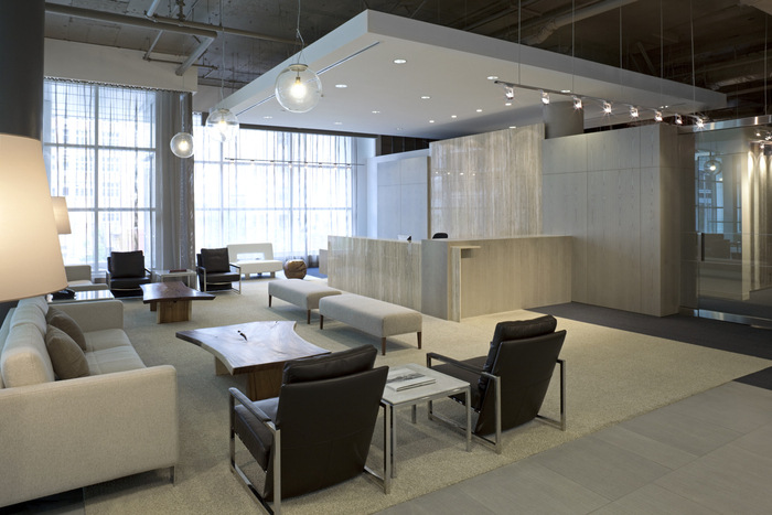 干净的现代细节和建筑形式承认了建筑的现代主义设计,但被软化以营造温馨友好的氛围,并通过自然灵感的调色板和自然纹理和图案突出公司对自然环境的尊重??攀教旎ò搴痛笮投ㄖ频踝雇怀隽丝占涞墓婺:吞寤?,同时通过家具提供了具有现代经典参考的住宅特征。#办公室空间设计公司#