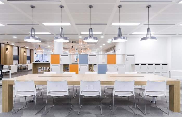 这是一个明亮通风的空间,拥有大而深的地板,挑战是最大限度地将自然光引入空间的深处。接待处就是一个例子,座位毗邻外立面,让光线进入这个接待空间。设计师选择了材料的调色板,因为它们的寿命和坚固性,将现代可丽耐与实心混凝土和橡木镶板形成对比,这是一种传统的英国建筑材料。#办公室设计装修效果图#
