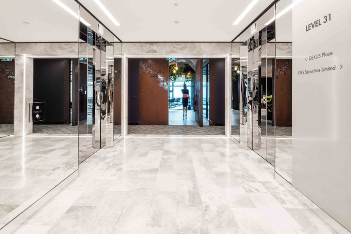 通向青翠的入口,布里斯班周围起伏的山丘和山谷在内部相互转换,郁郁葱葱的绿色植物、浅色的石头和模仿山坡起伏的分层接待台。自然光是空间的一大特色,营造出温暖而令人振奋的氛围,让人联想到城市本身。#公司办公室设计案例#