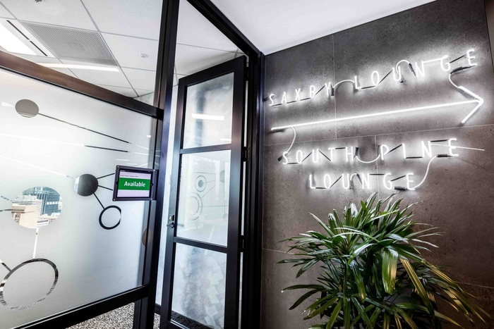 通过霓虹灯、铜管和城市元素等定制组件的对比,河流与城市景观的关系以及鹅卵石般的地毯纹理和颜色反映了布里斯班的河床、水和当地植物群。#公司办公室设计#