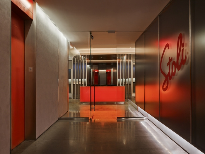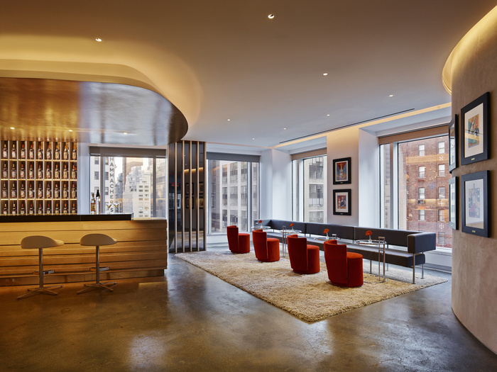 红色玻璃办公桌和超大酒吧点缀着面向公众的活动空间。酒吧里的石灰石向瓶子上的莫斯科酒店致敬。酒吧本身向痴迷于混合学的美国文化致敬,伏特加从来都不是孤立的。除了这个多功能区之外,经典的红色和雅致的家具遍布整个明亮、开放的办公空间。#时尚办公空间设计#