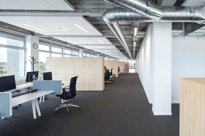 封闭式走廊和独立办公室的传统布局转变为带有隔音天花板的开放式概念。新的室内概念展示了裸露的混凝土结构,优化了刚性战后办公楼的空间品质。#办公楼设计装修#