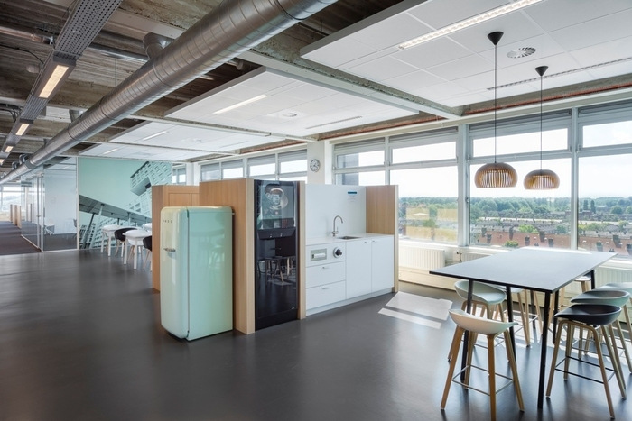 玻璃会议室构成了开放式办公区,休息室和储藏室区域为办公楼层增添了色彩。颜色和图案的选择灵感来自50年代的流行色彩。7楼作为一个特殊的项目环境与会议室和触地得分共享。企业的丰富文化在图形和签名中得到了特别的体现。朴素的办公室一览无余的景色几乎将多彩的企业品牌带入了员工的日常实践中。#办公楼设计效果图#