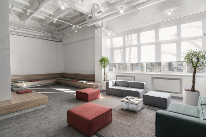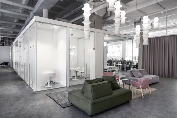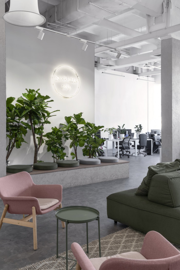 以柔和的圆形形式和家具支撑的几何直线,实现整体书写风格的视觉轻盈??趴占湟悦髁恋纳首笆危怀龊投员刃菹星?。该项目选择了一种轻盈宜人的质地,结合房间的工业风格建筑。纺织品柔和的颜色、透明玻璃、混凝土和木饰面。柔软的形式和复杂的纹理相结合,为开放空间的办公室创造了一种舒适感。#办公室装修案例#