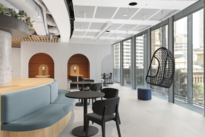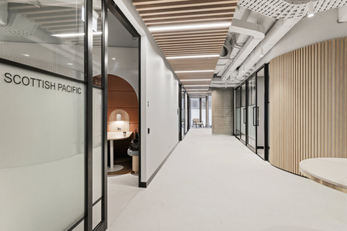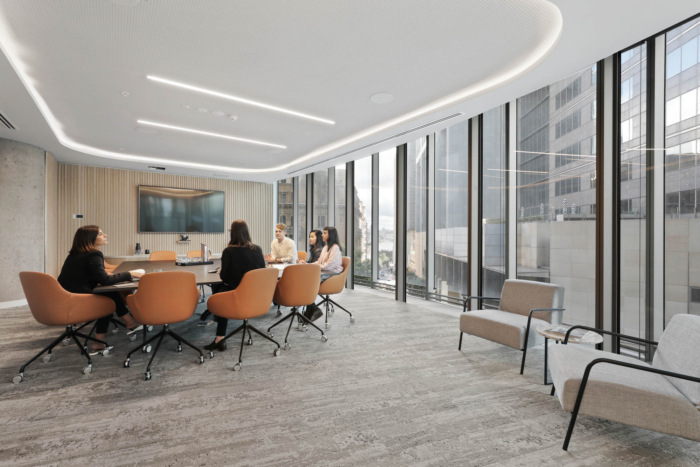 大地板靠向中央客户和员工休息室、员工论坛和厨房,从接待处和会议室通向。从接待处和董事会会议室到中央枢纽的流动促进了透明度和包容性的概念,为员工和客户的大型市政厅会议和社交聚会提供了机会。#办公室装修设计公司#