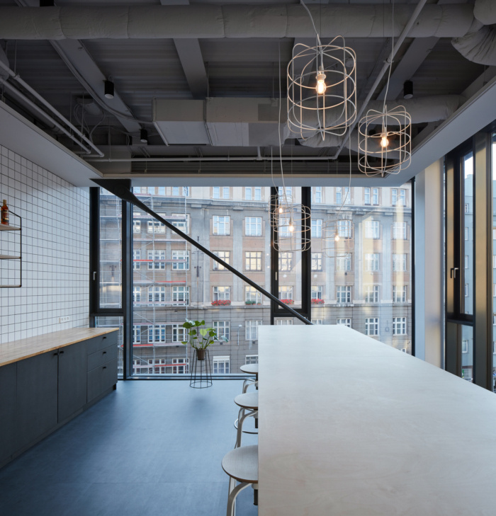 柔软、舒适的云杉板条和坚硬、冰冷的胶合板表面不时互相吼叫和咒骂,但当涉及到真正重要的事情时,他们相处起来很容易。比如当需要为个人工作和合作定义空间时,或者当需要将人们联系在一起时。裸露在外的科技天花板仿佛刚刚盖上了一层白色的面纱。它的管道和管道在背景中安静地嗡嗡作响……#办公室设计装修效果图#