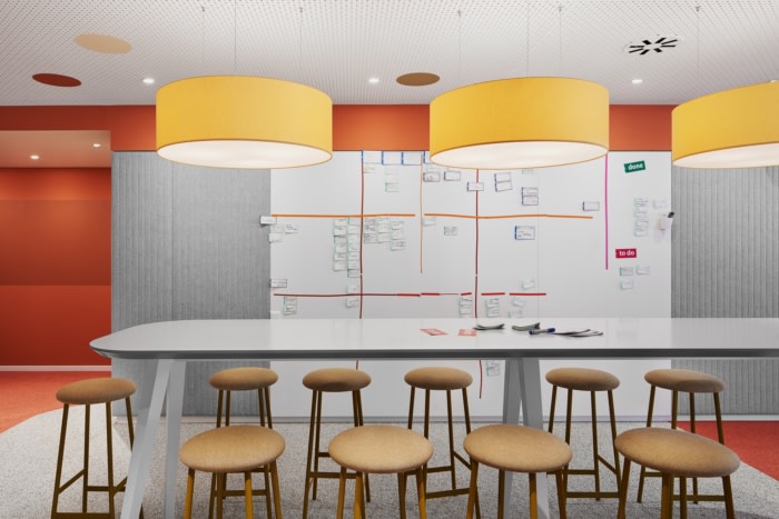 独立式餐具柜提供可锁定的存储空间并包含作为引导对象的特定区域,从而创造隐私。媒体技术直接集成到软垫墙中。照明概念突出了房间面板和软垫墙作为构成开放式办公室并赋予其明确特征的同质元素。#办公楼办公室装修公司#