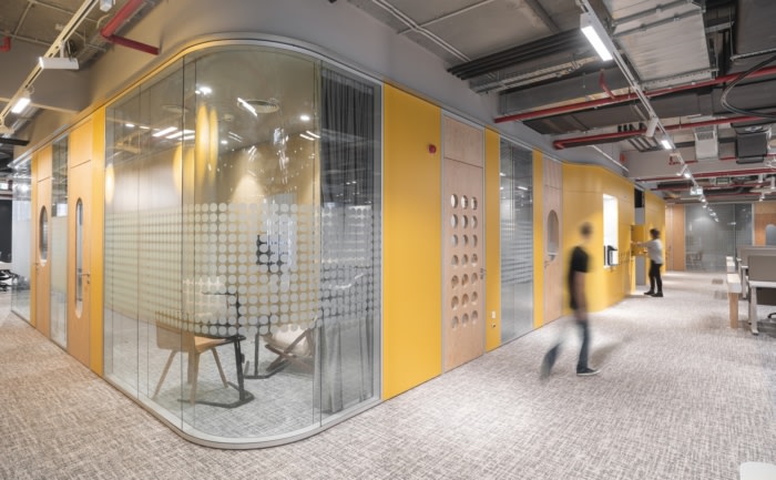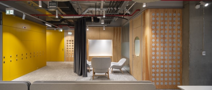 尽管提到了工业过去和科技未来,但通过使用流线型、友好的形状、天然材料和柔和的色彩,这个地方温暖宜人:天然贴面(松木、白蜡木、橡木)、用于吸音元素的天然羊毛毡,木纤维天花板处理,软木隔音墙。#办公室装修案例#