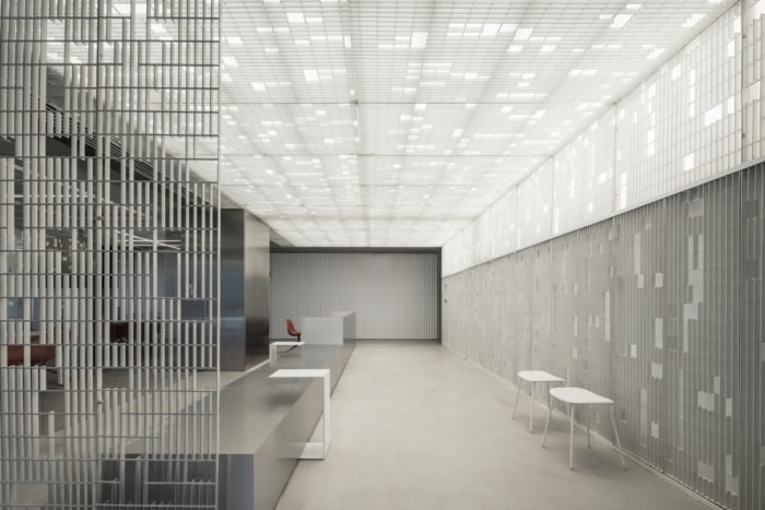 钢格板被解开以创造一种新的模式,并从简单的网格转变为工业花边。这种编织状的隔断在不阻挡空间的情况下产生了分隔。这种所谓的编织的开放性使得周围城市景观的微妙、分层视图成为可能。白色波纹聚碳酸酯板被设计成更加自信的分区,提供更多的隐私。#办公室设计效果#