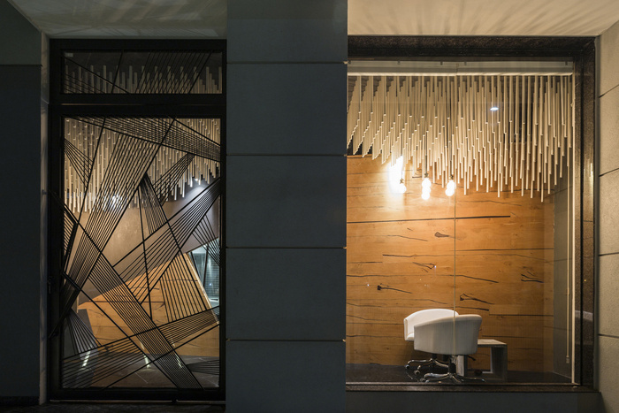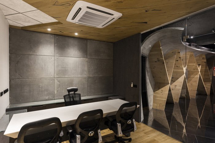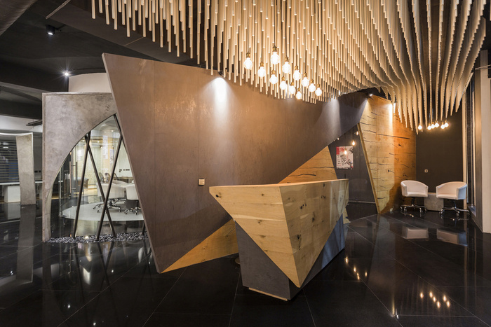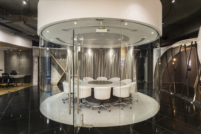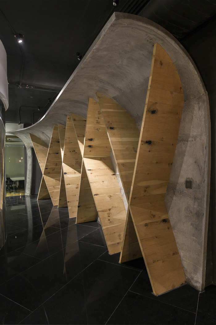 办公室的入口由一扇 9 英尺 x 6 英尺宽的旋转金属门定义,设计由锥形金属管组成。接待区采用参数化设计的装置,使用 1500 根圆形杆悬挂在天花板上的有机波浪结构中。在广阔的空间中创造戏剧性,会议两侧是采用特殊施工技术和加固方法设计的三维曲线结构。黑色镜面花岗岩地板将办公空间的各种元素结合在一起。#办公室空间设计案例#