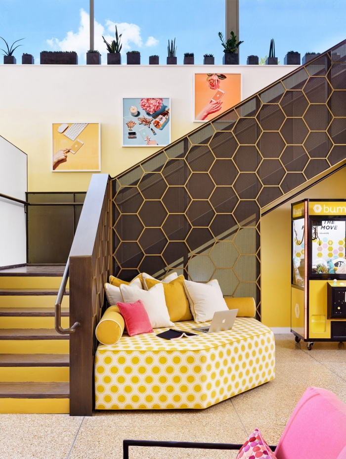 《蜂巢》的图形和整体风格的愿景受到各种灵感照片的影响,设计师将六角形墙布和以生活方式为中心的环境的愿景变为现实。#办公室装修设计公司#