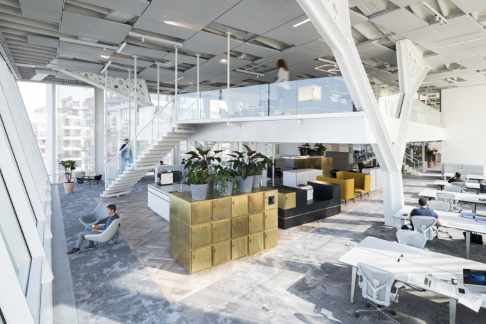 专门开发的天花板用作冷却和加热,并增强声学效果,通过使用许多植物、带有WiFi接入和不同区域的屋顶花园也可以激发健康的环境,以促进户外工作。#广州办公室装修公司#