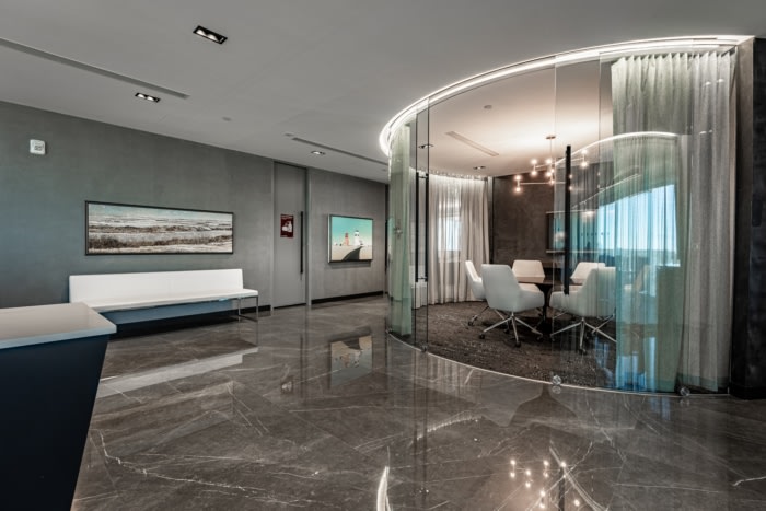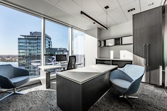 灰色、黑色和白色的室内色调与家具和门的木质饰面相结合。12楼包含客户区:接待区、等候区和会议室。这层楼旨在展示河谷蜿蜒穿过萨斯卡通市中心时的景色。12楼还设计有一个长长的服务柜台和通往每个会议室的双门——因此整个空间都可以用于客户活动。#办公楼装修案例#