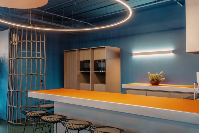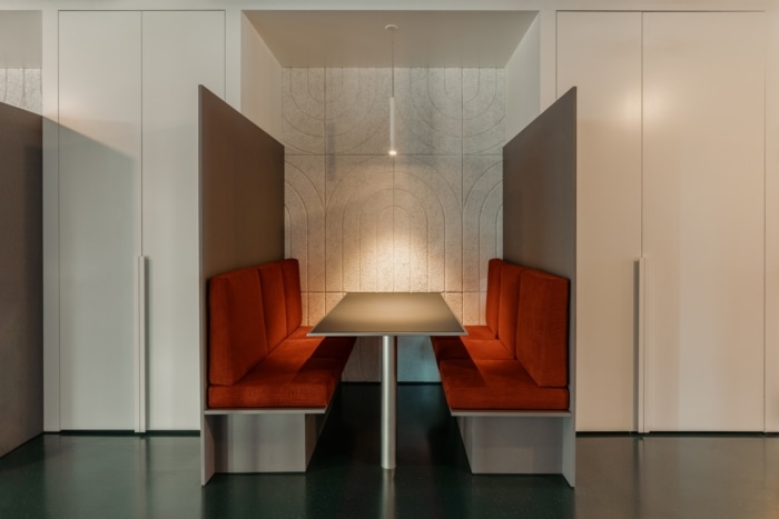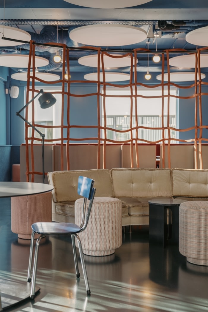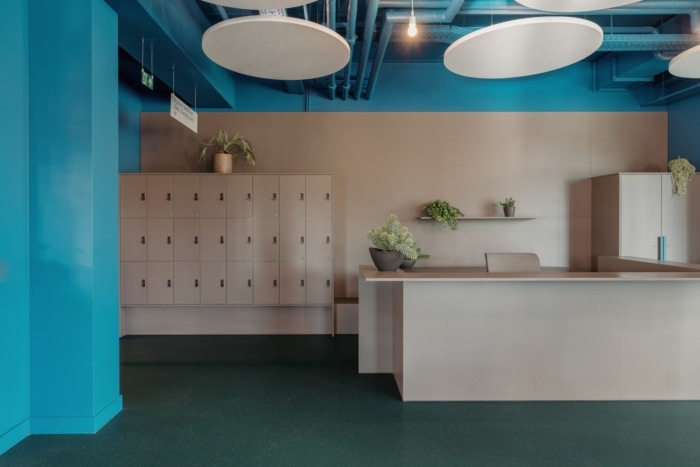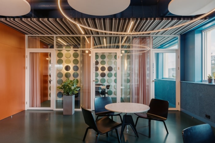 圆形隔音元件取代了以前的假天花板,以暴露工业空间的真实高度和开放性。这些圆形以木毛圆和几何切口的形式延续到墙壁中,形成对比鲜明的蓝色、绿色和黑色阴影。这种转变有助于形成一个连贯的整体,其中冷却和声学元素成为设计的一部分。#办公室空间设计装修#