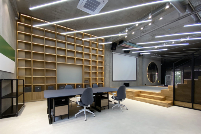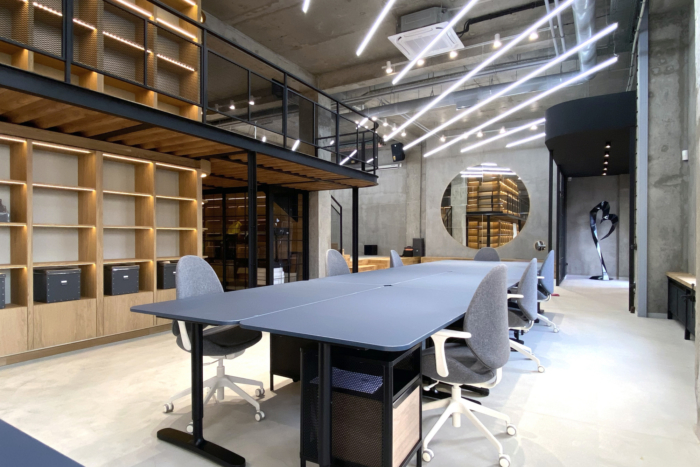 设计的中心是从地板到天花板的高度架子,将空间交织在一起。它们旨在以最佳光线展示公司的视觉作品,并存放其大量的图书馆藏品和办公用品。木材为空间带来温暖,并平衡了建筑物现有的未受影响的混凝土结构。实施了不同的温暖和照明模式,以对应空间的各种用途和情绪。#办公空间设计公司#