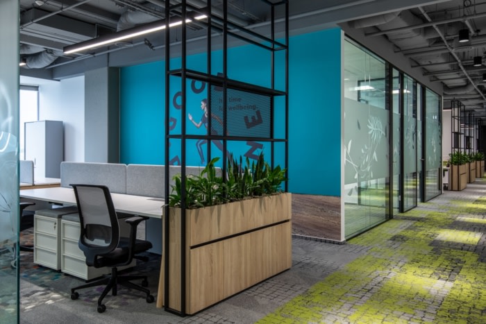 通过使用仿生学,设计师将有机形状的概念家具、受流体树枝启发的玻璃隔断箔、具有自然图案的地毯、唤起城市与自然环境之间同样强烈联系的地毯纳入概念家具中。漆成灰色的深色裸露天花板用作背景,以强调白色墙壁增强的自然采光。合作区由种植活植物、花盆和活墙的绿色角落完成。#办公室装修公司#