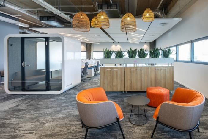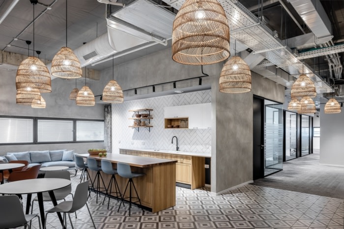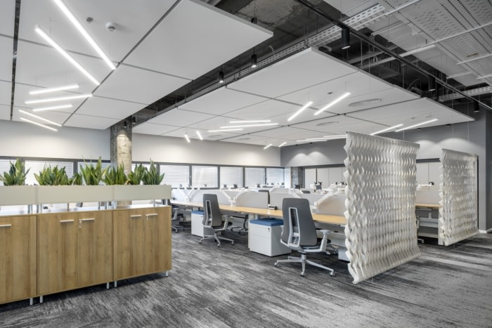 在设计公司的新办公室时,设计师强调使用与医学界建立联系的元素——脊柱、椎骨和连接器,并应用了美学和流线型的设计语言。通过在中央自助餐厅空间中使用类似于脊柱曲线的凸形天花板创建了一个设计序列。天花板元素在地板上收到了“响应”,地板上包含镶嵌在混凝土地板上的木纹瓷砖。#公司办公室设计#