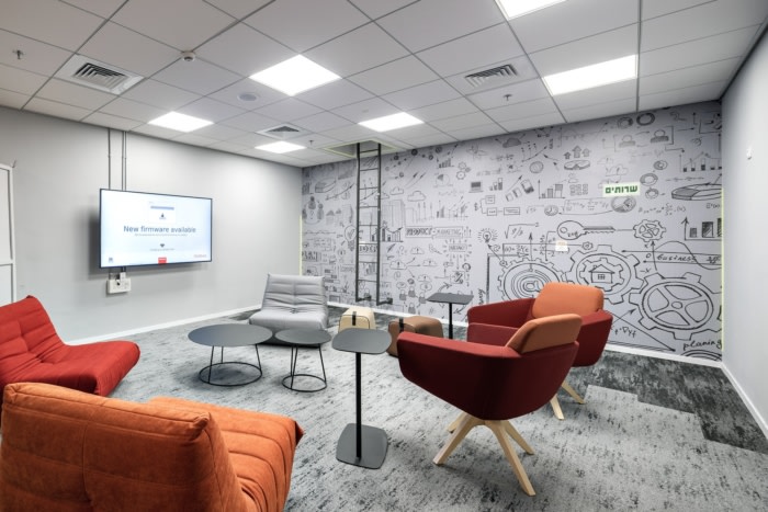 空间中照明设备以及开放空间工作区的重复和运动变化再次在“椎骨”元素中引用,这是一个将工作站与公共区域分开的半透明隔板。地毯旨在反映心电图的线条,记录手术期间心脏的电活动,并回顾公司的活动范围;接待台上方的灯具和入口大厅的覆层也代表了医学界的元素。#高端办公室设计#