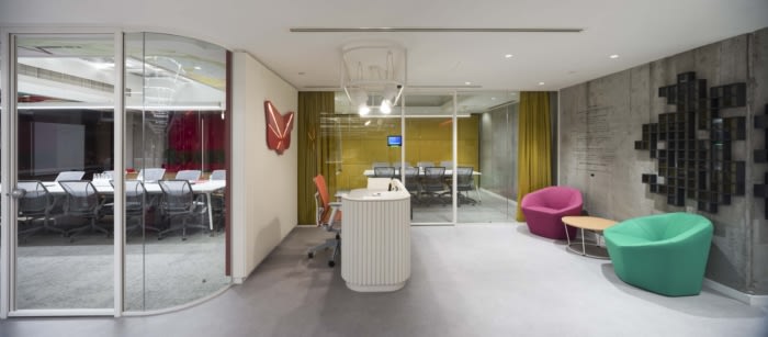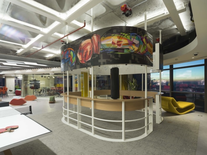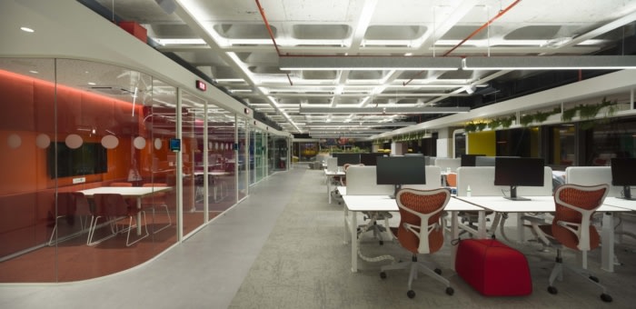 接待区和后面的两个大会议室在主入口欢迎用户。从入口到社交区域一字排开,封闭的面试室配备了满足团队技术和体力需求的设备。这些房间按照“单色”配色方案设计,内部有声学处理和地毯地板,以增加舒适度。#办公室装修设计#