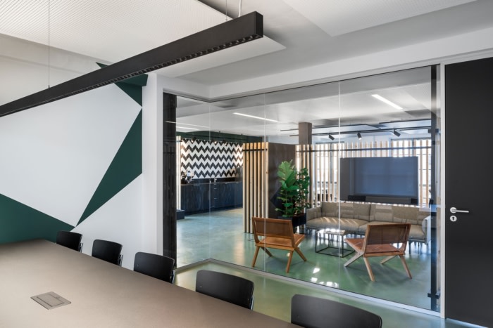 带有标志的设计分隔元素作为公共区域入口后面的引人注目的标志作为分区,由板条结构组成,作为光学分隔器,仍然允许光线和扫视。建筑穿过拐角,不仅可以容纳电视,还可以用玻璃冰箱和返回柜覆盖饮料区。#办公楼装修公司#