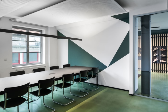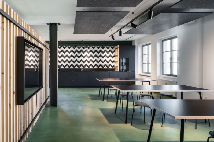二楼用作开放式办公室,也有团队会议室。作为一楼的视觉提示,在厨房外观的入口区域设有一个咖啡角和站立会议,也有重复黑白对比作为设计元素。通过带有板条结构的餐具柜镶板进行光学分离,用于工作区岛屿。#办公楼装修方案#