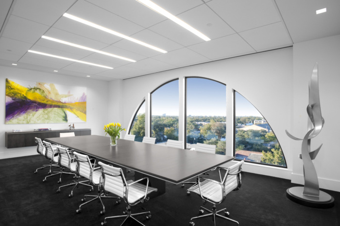 通过深思熟虑的空间规划、室内体量和材料选择,设计团队满足了公司的空间形式和功能需求,并为所有员工创造了一条视线,无论是在办公桌上还是在休息室,都能看到壮观的天际线景观。建筑团队向外部开放了三个视图,增加了可用的自然光。此外,内部玻璃隔断的战略性使用允许部门之间进行视觉交流。#办公室空间设计#