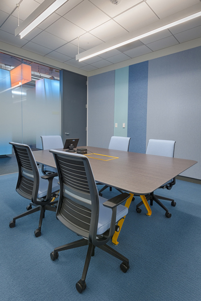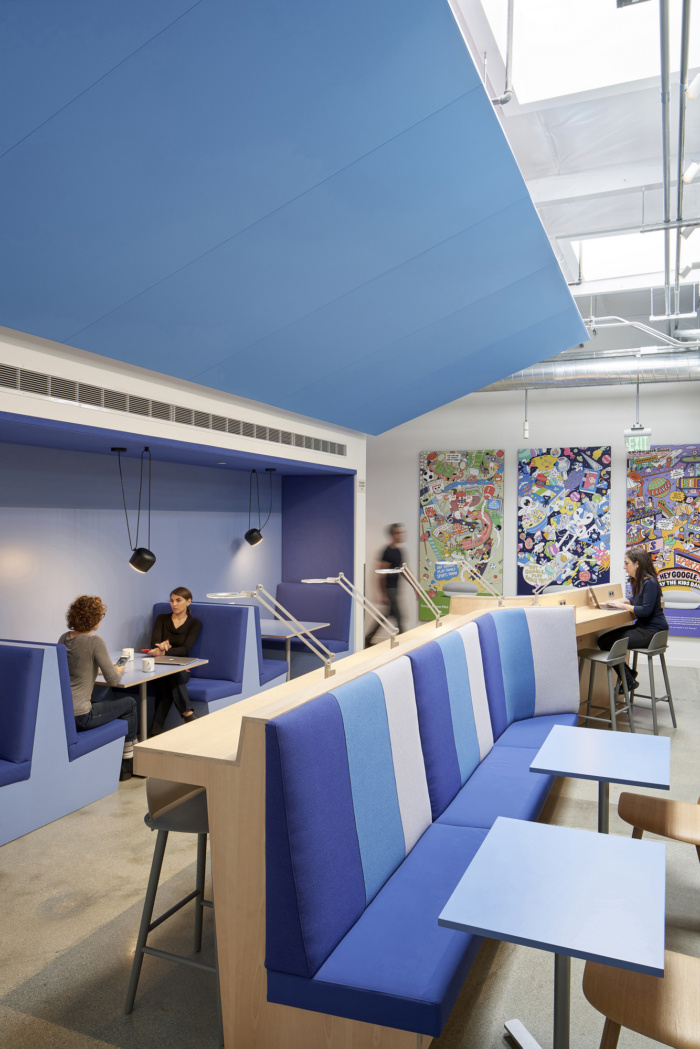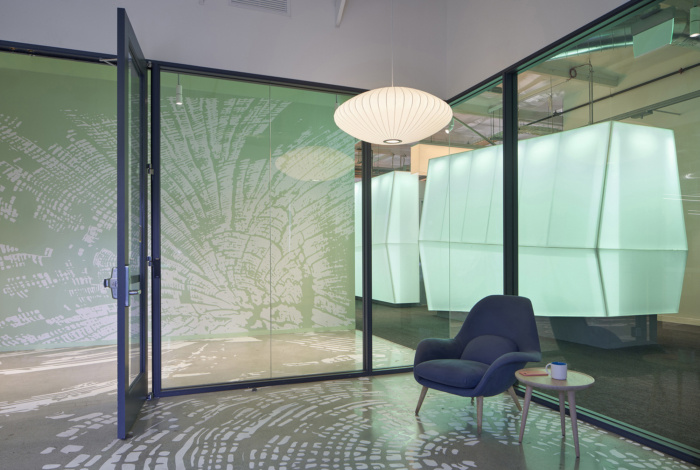 休息区专为营造居家氛围而设计,配有地毯、抱枕和各种照明类型。员工厨房战略性地位于连接路径上,以帮助促进意想不到的互动。休息室的绿色墙壁和天窗体现了企业将亲生物融入工作场所的意图。每栋建筑都有一个特定的调色板——春绿、天蓝或日落蓝——来庆祝加州的气候。植物等亲生物元素和连接路径向更大场地的自然美景致敬。#公司办公室装修方案#