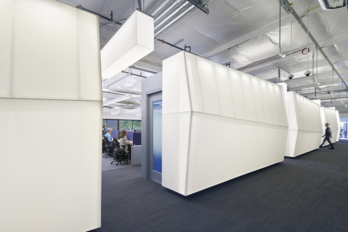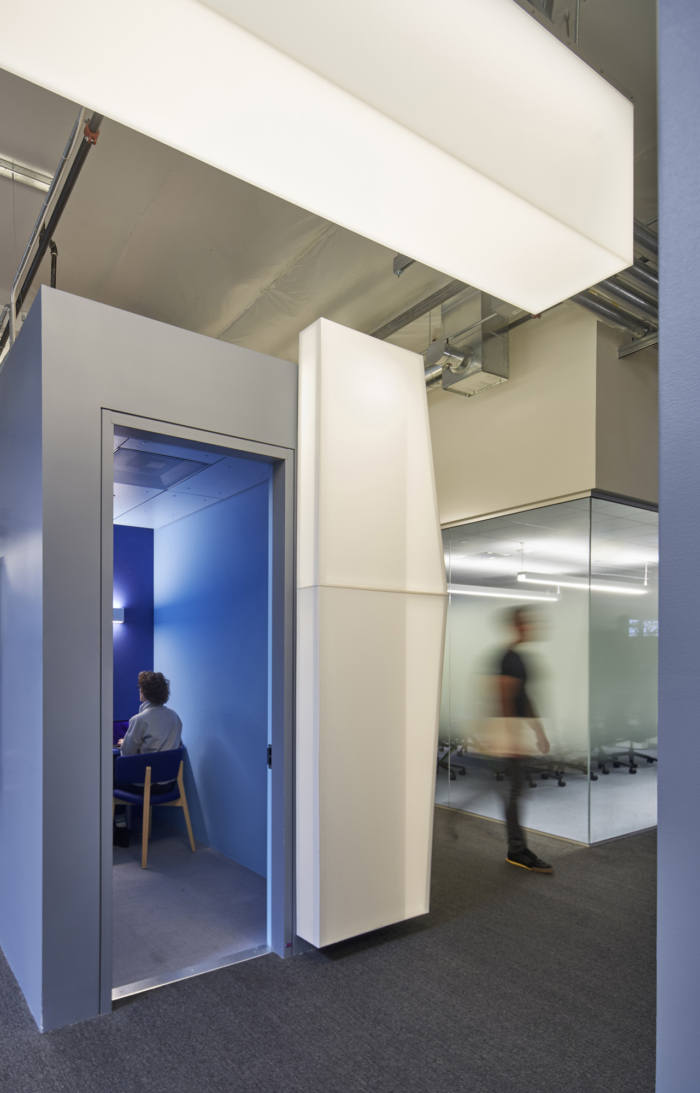 毛毛虫由半透明的白色织物制成,横跨定制的金属框架,在办公桌和会议室、休息室和厨房的创意混乱之间充当了一个加厚的门槛。作为开放式工作站的对立面,它产生了一种平静的感觉。沿着毛毛虫移动是与工作空间强度和空间感官的对比。虽然会议室典型的玻璃墙很熟悉,但经过高度调整的灯光和柔软的织物表面与反光玻璃搭配,却是一种意想不到的愉悦。#现代办公室装修风格#