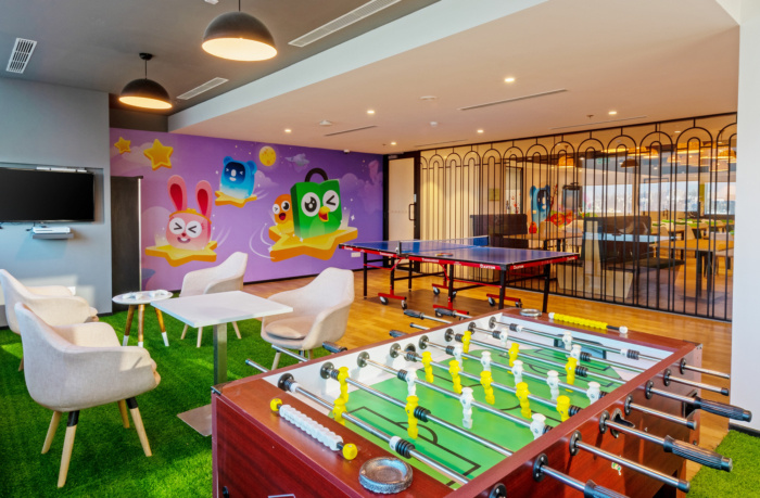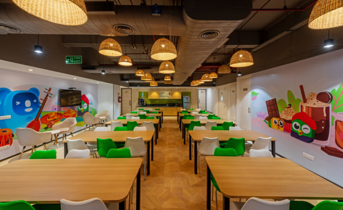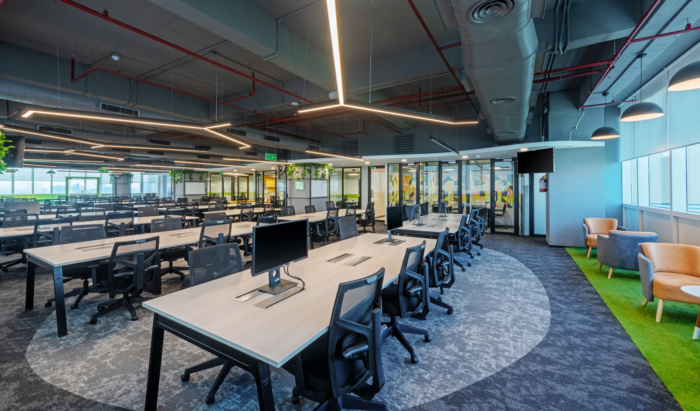 办公楼装修使用明亮的色彩和裸露的天花板 保持了更广阔的空间感