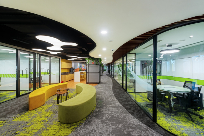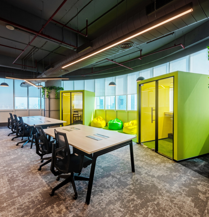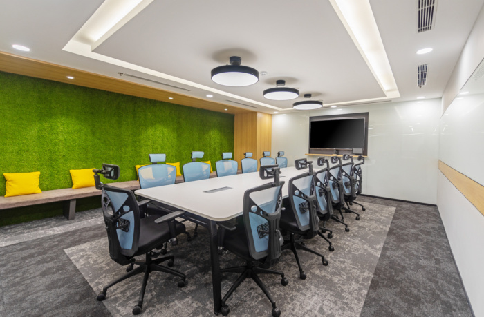 非常干净整洁的空间是从头开始雕刻出来的,通过融合现代外观和风格来投射能量和热情。设置简单而独特。不同色调的绿色、灰色和黄色——从地毯到家具,整个地板都呈现出独特的色调。通过在会议室使用明亮的色彩和在工作站区域使用裸露的天花板,该项目保持了更广阔的空间感。通过非常简单和非正式的设置,这种设置为他们提供了一个互动环境,不仅可以照顾到企业的福祉,而且还为他们提供了一个社交平台。#办公楼室内设计装修#